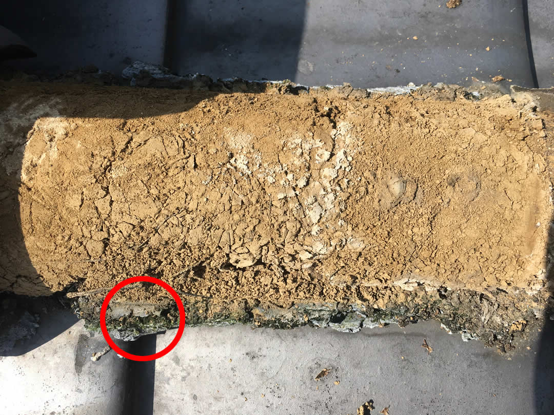 劣化していない部分は一塊で瓦をしっかりと固定します。ですが、水分の吸収を繰り返して、いずれは粒子状に変化します。