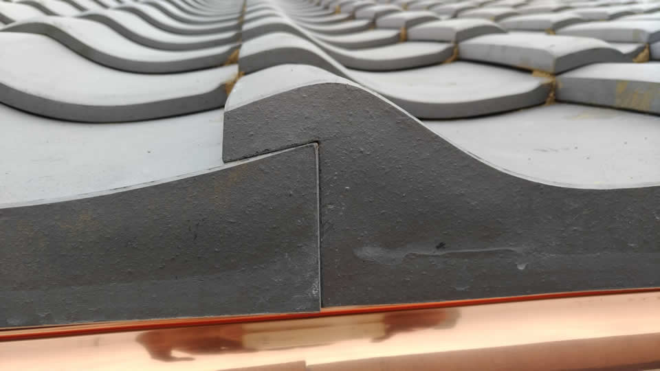 一文字唐草は全て手作業でこの接合部分を擦り合わせて行かなければなりません。泥を焼成して製品化する為、寸法調整も含めて既製品をそのまま取り付けることができないからです。